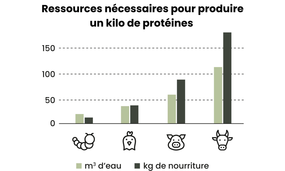 Première promesse : ces croquettes à base d’insectes — plus précisément à base de mouche soldat noire — seraient plus écologiques. Il est vrai que, si l’on compare les insectes et les vertébrés, à savoir les poulets, les cochons et les bœufs, ces premiers ont un meilleur food conversion ratio, c’est-à-dire qu’ils nécessitent moins de végétaux pour produire la même quantité de viande [2]. Ils sont également moins émetteurs de gaz à effet de serre [3].