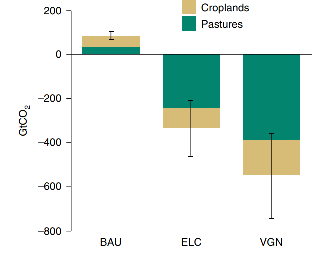 - Dans un scénario où l’alimentation deviendrait 100 % végétale, cette absorption de carbone atteindrait 547 gigatonnes de CO₂, soit 16 ans d’émissions fossiles.