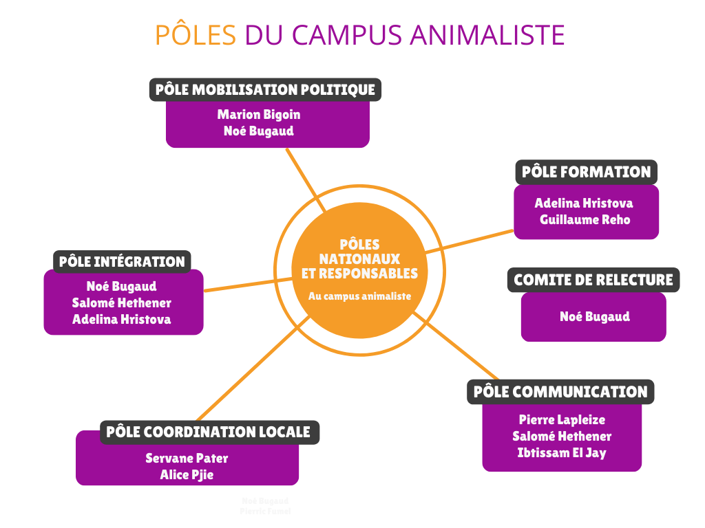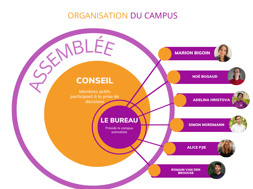 Le bureau du Campus animaliste est composé de 6 co-président(e)s. Leur mandat est d’une durée de deux ans et peut-être renouvelé par réélection.